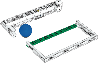 Blue ball kicked (by foot) into green goal area and bone bridge not on mat?